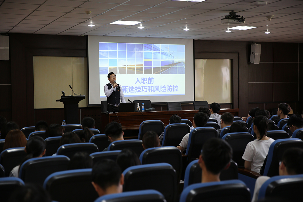 讲座中,高飞详细讲述了毕业生入职前的注意事项,“怎么样能有效甄别企业?眼观、耳听、口问、鼻嗅。”高飞用大量的职场实例告诉同学们,入职前,一定要通过企业调查、面试嗅探、offer比较,全面了解企业的情况。他讲到职场可能存在的“四大陷阱”,即offer陷阱、合同陷阱、“变脸”陷阱、“甲方”陷阱,提醒毕业生入职前要有一双甄别陷阱的“火眼金睛”,有效防控择业风险。高飞生动精彩的讲座,引得现场掌声不断。